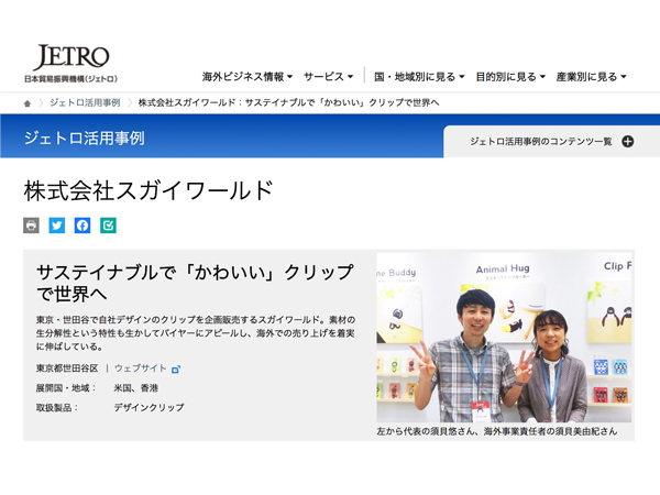 NEWS 2023.04.26 WEB「JETRO」ジェトロ活用事例にスガイワールド掲載 日本貿易振興機構(ジェトロ)活用事例としてスガイワールドをご紹介いただきました。 この度は、ご紹介いただきありがとうございました! 掲載記事は▶︎こちら BACK TO LIST