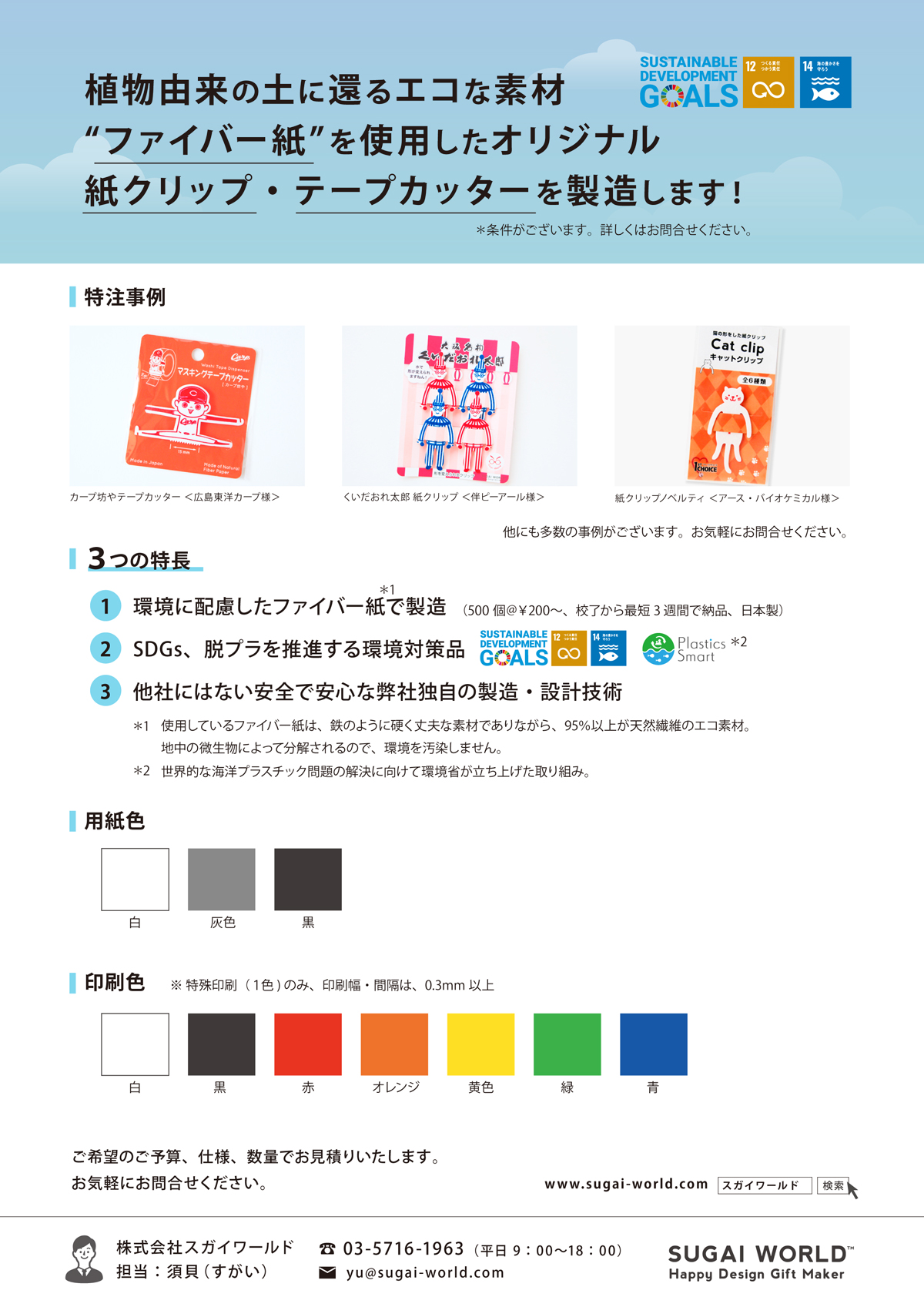 NEWS 2020.08.20 スガイワールドSDGsの取り組みについて スガイワールドは、環境に配慮したファイバー紙で製造し、SDGs、脱プラを推進しています。 ※SDGsとは、「Sustainable Development Goals」の略で、「持続可能な開発目標」のことです。 2015年9月の国連サミットで採択された、2030年までに持続可能でよりよい世界を目指す国際目標です。 資料のPDFは▶こちら SDGsは▶こちら お問合せは▶こちら BACK TO LIST